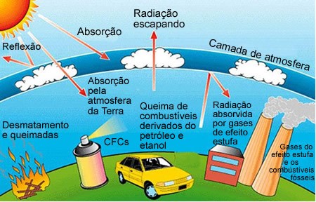 Os gases que formam o efeito estufa são: Vapor de Água, Dióxido de Carbono, Gás Metano, Monóxido de Carbono, Clorofluorcarbonos, Óxido de Nitrogênio, Dióxido de Enxofre e Gases Fluoretados. Os Gases Fluoretados são produzidos pelo homem para atender às necessidades industriais, responsável pela destruição da