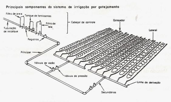 no qual pequenos furos em canos ou mangueiras flexíveis, que se estendem ao longo das linhas das plantas, deixam que gotas d’água caiam pelo solo, mantendo ele úmido, pois distribui a água lentamente e diretamente na