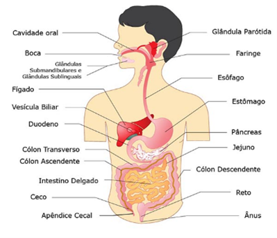 O sistema digestório é formado pela boca, faringe, esôfago, estômago, intestino delgado, intestino grosso e ânus. Fazem também parte desse sistema as seguintes glândulas acessórias: glândulas salivares, pâncreas e fígado. A digestão inicia-se na boca, com a ação da saliva e dos dentes.