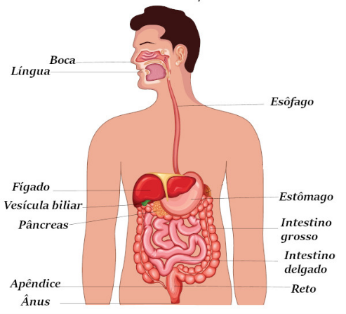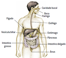 O sistema digestório é formado pela boca, faringe, esôfago, estômago, intestino delgado, intestino grosso e ânus. Fazem também parte desse sistema as seguintes glândulas acessórias: glândulas salivares, pâncreas e fígado. A digestão inicia-se na boca, com a ação da saliva e dos dentes.