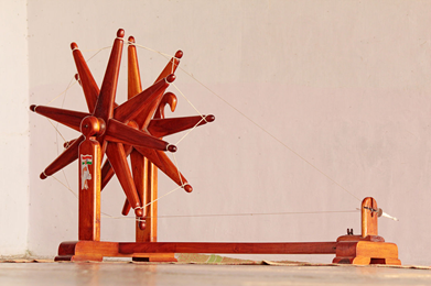 Significa “roda giratória”, uma ferramenta manuseada para fiar, que consiste em uma mesa apoiada sobre quatro pés, com uma roda montada em uma das extremidades. Referente aos ensinamentos de Mahatma Gandhi. A charkha lançou as bases para as máquinas posteriores, como a máquina de fiar e a estrutura de fiação, que substituíram a roda giratória durante a Revolução Industrial.