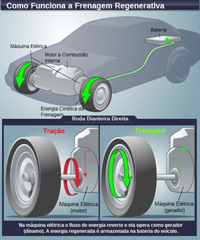 Os freios regenerativos transformam a energia cinética da freada em energia elétrica. Em automóveis convencionais (motor a combustível), essa energia é utilizada em componentes elétricos do carro. Já em carros híbridos (motor elétrico e de combustão interna) e elétricos, a energia vai para a bateria, usada para mover o automóvel.